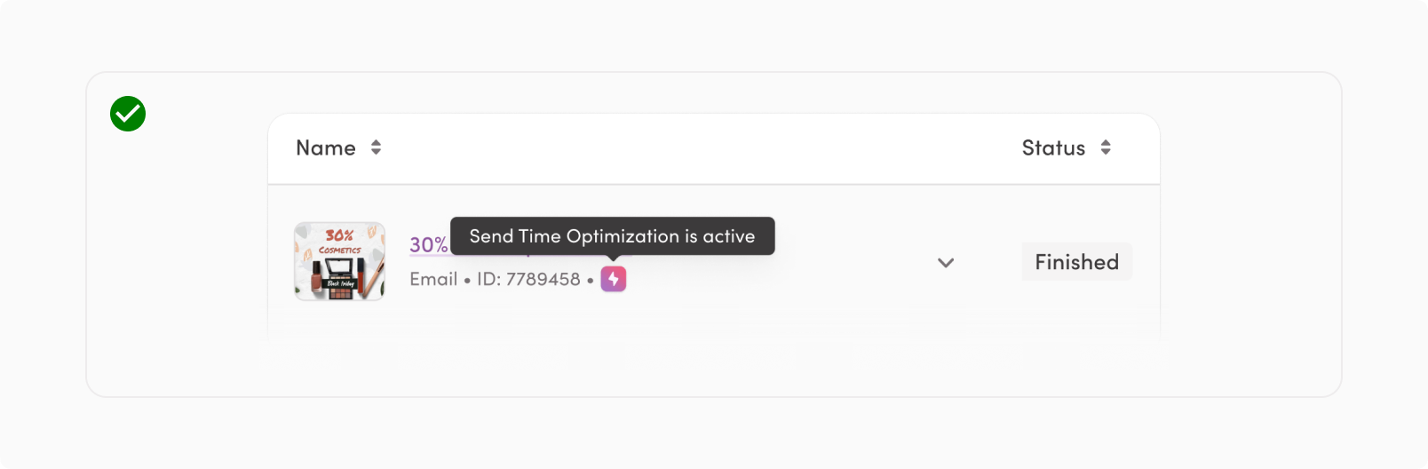- The bolt icon is used in resource metadata when there is an active AI feature, for example a campaign with Send Time Optimization running.